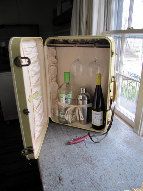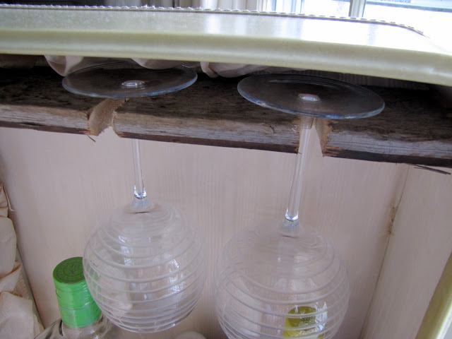 I used a scrap piece of wood from a shipping pallet and notched out 2 spots for the glasses to hang.