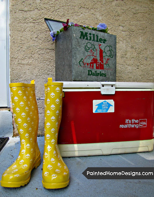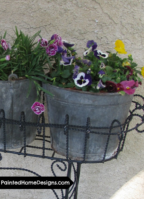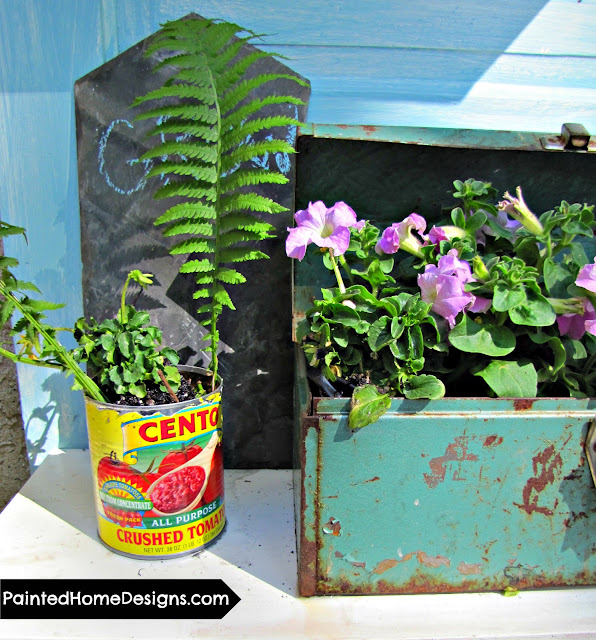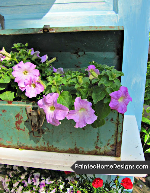 I'm loving these rusty metal file boxes as instant flower boxes on the steps up to the front of our home.