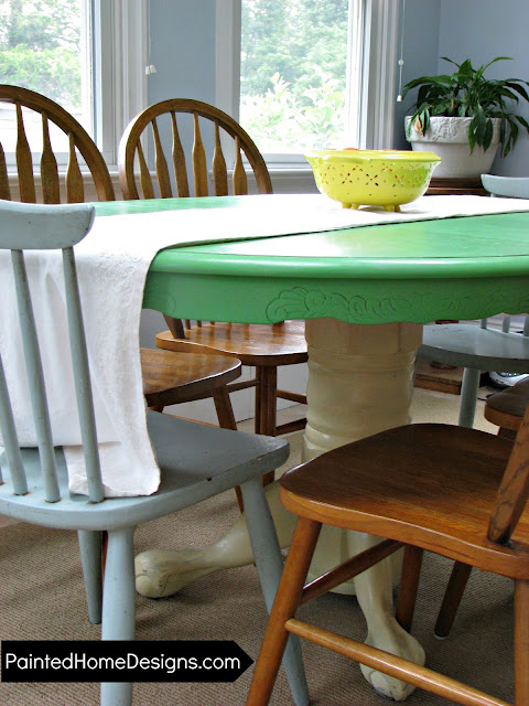 I painted the top of the table Antibes Green and the bottom half the Old White.