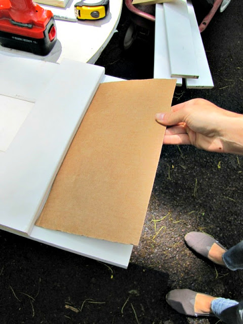 Drill from the back of the shutters, attaching the smaller piece to all 3 long pieces.