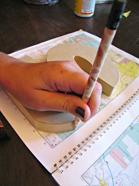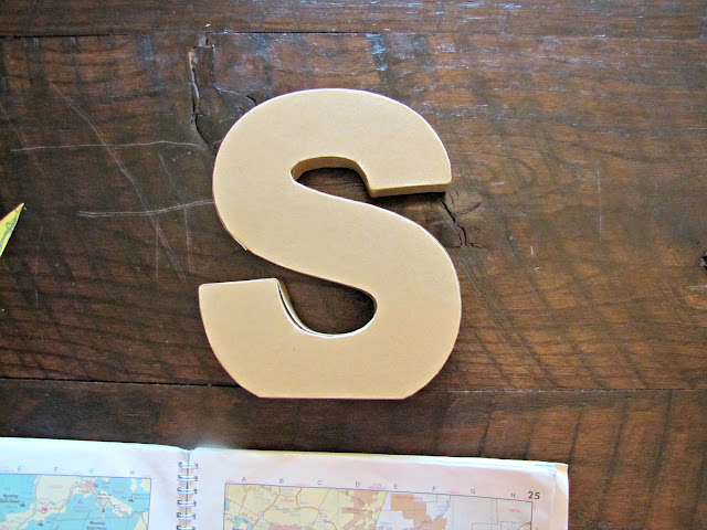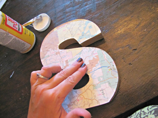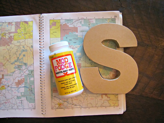 Start with some paper (wrapping, map, construction, etc..., Mod Podge, and an initial letter (which you can sometimes find in the dollar bin at Target).
