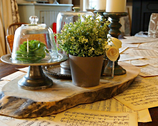 I used silver trays, crocheted doilies and a slice of wood to mix up the textures.