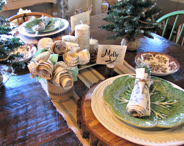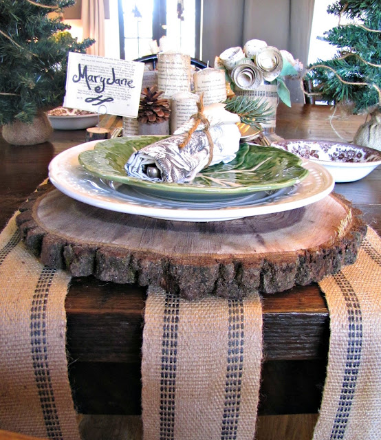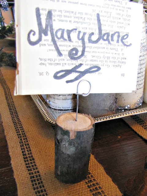 The place cards are made of vintage book paper and logs. I drilled a tiny hole into small logs and inserted a twisted wire to hold the name card.