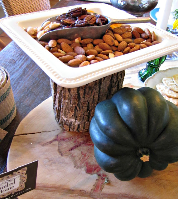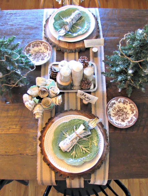 In the center of the table I placed glittered and paper wrapped candles on a silver tray with pine cones and logs sprinkled around about.
