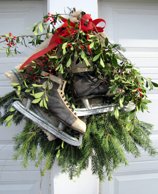 then, layer...the burlap, cuttings, ice skates, ribbon.