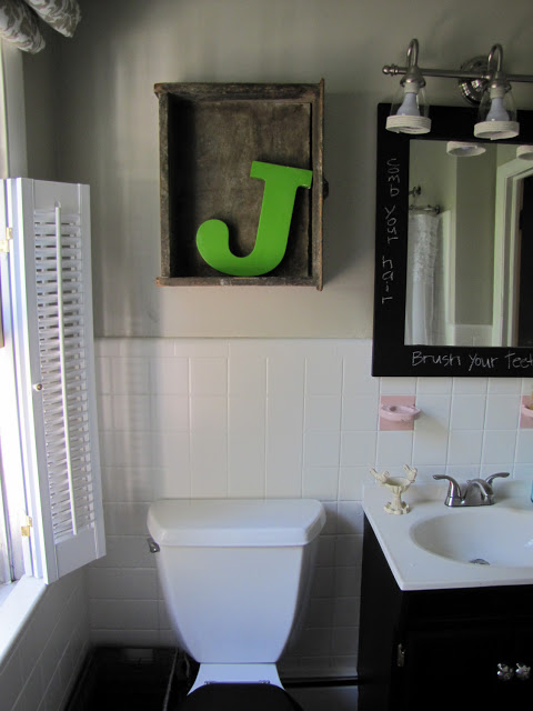 I found you through FJI. I love the old drawer and the bright green J - a wonderful composition. I also like the mirror with the chalkboard paint and the grooming reminders. That is awesome. I am going to have to try that with my son.