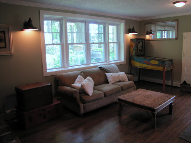 This is SO cool!!! I love the whole look! Did you lay hardwood floors over concrete yourself? We have to do that in our den and I'm a little hesitant to start it..not sure. Great job on this room - JenT