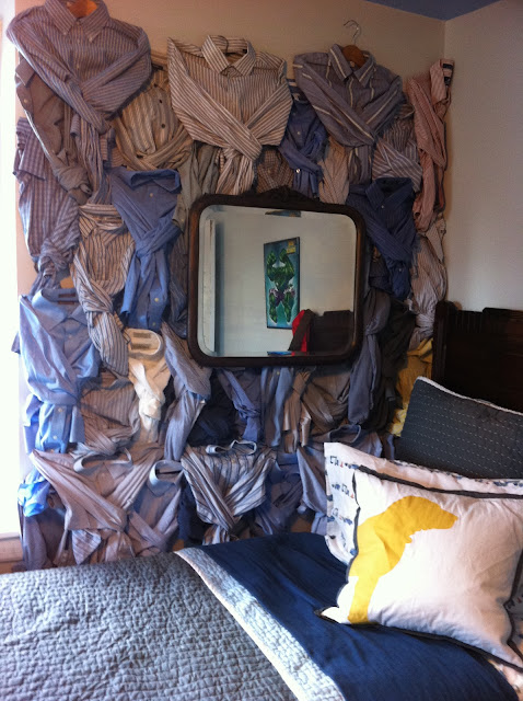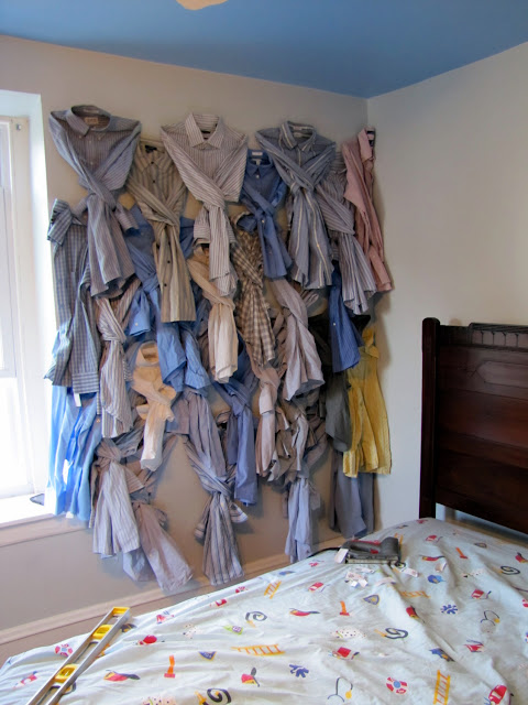 We began at the bottom of the wall and stapled the shirts in a "brick" pattern.