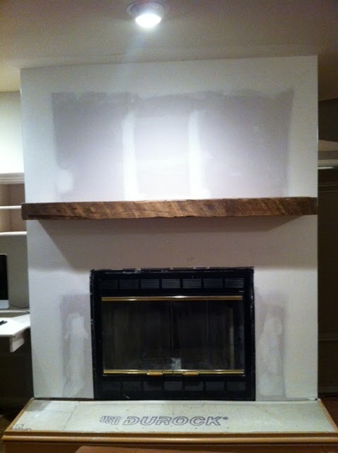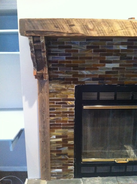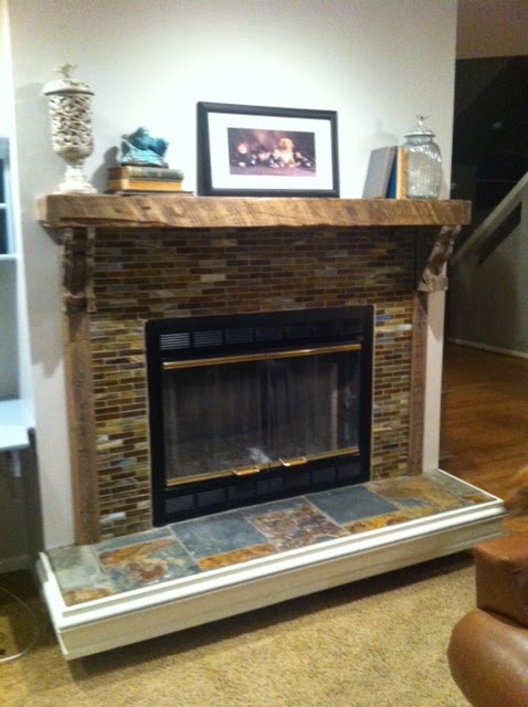 an aged barn wood mantel to create this one of a kind fireplace for my client Angie.