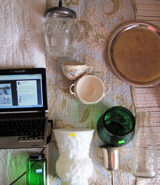 I laid out all my vintage finds and compared them to Heather's photo of her shelves.