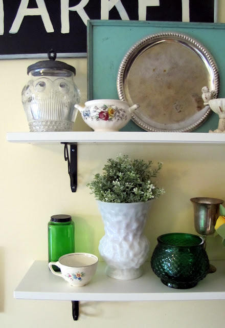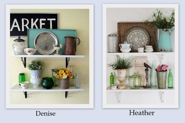 Denise... it looks great! I am always reminding myself to use what I have. glad my shelves inspired and made you smile! I love the market sign you have above your shelf. I have been looking for something to put above the top shelf... some type of advertisement sign or something. I will know it when I see it I guess. have a great day! xo Heather