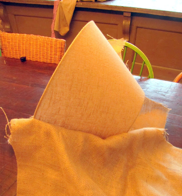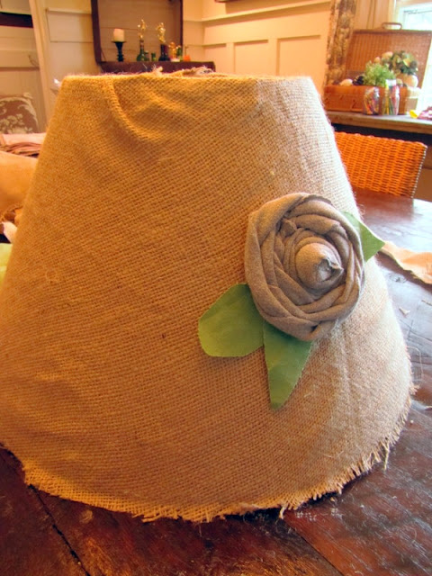 I laid the shade on top of the burlap and hot glued, then rolled, hot glued, then rolled.