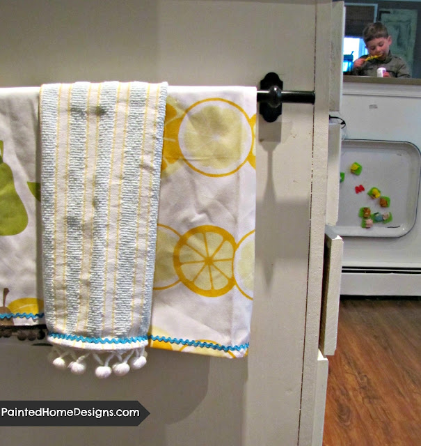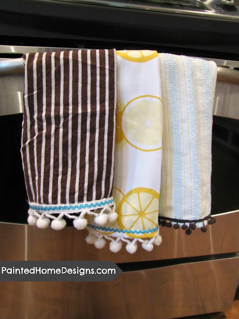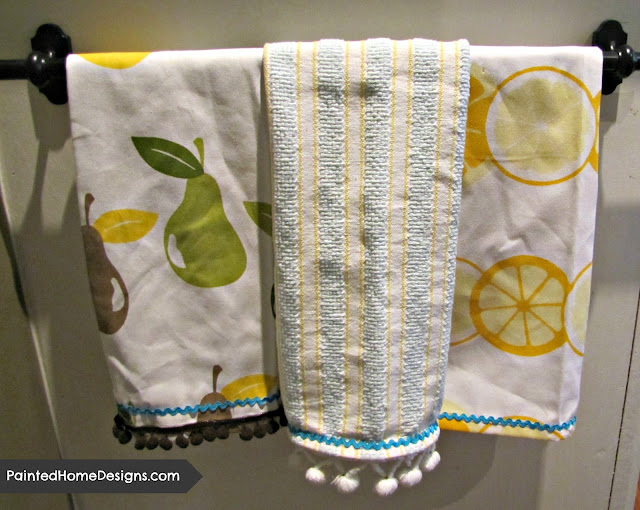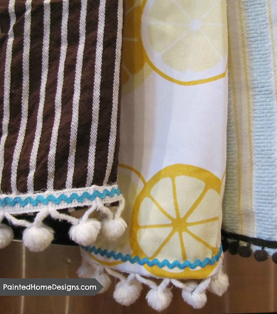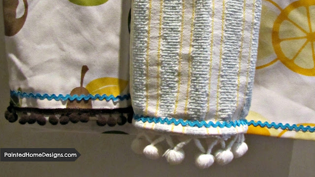 I realizes I had a few strands of trim laying around, so I decided to embellish the dishtowels a bit, along with a few oldies I had in the drawer.