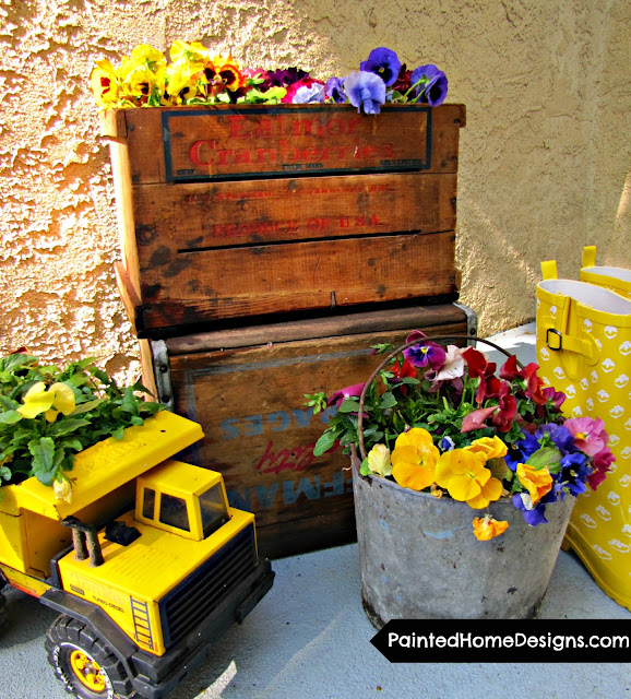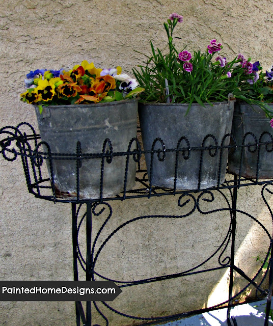 I'm loving these rusty metal file boxes as instant flower boxes on the steps up to the front of our home.