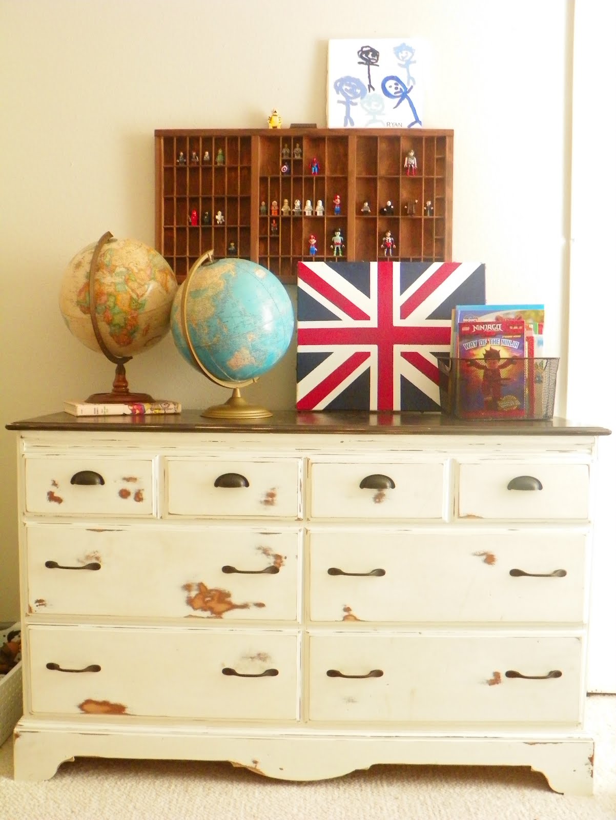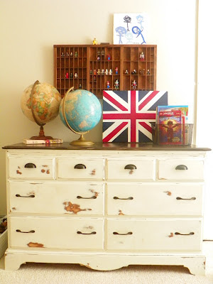 His dresser which you can read more about here and here. I love vintage globes so whenever I see one in good shape I purchase it for our little collection. We are not English, just admire the flag.