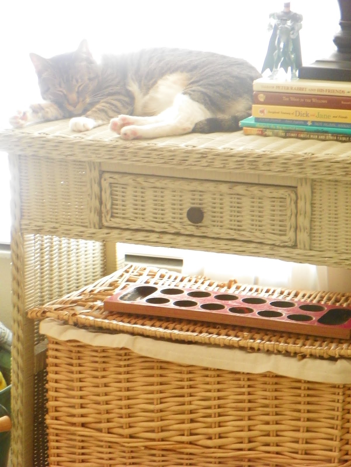 His nightstand used to be my vanity as a little girl. Kitty likes it in there too.