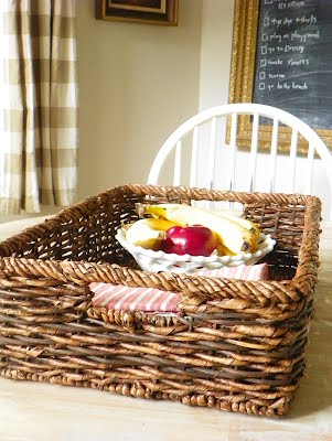 This basket holds our napkins and a milk glass bowl full of fruit.