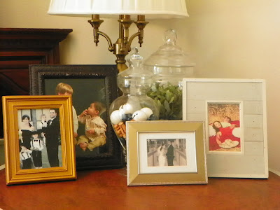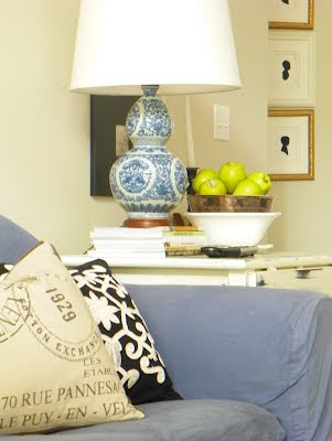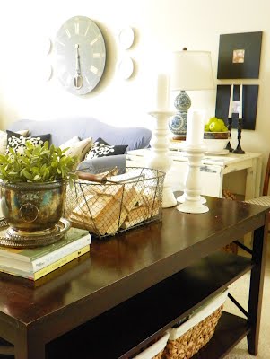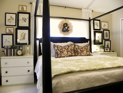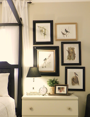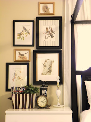 I was inspired by a photo I saw on Pinterest for the bird prints. They came from a book I bought a few years ago and all the frames I already had but painted black. {please pardon the missing lamp shade, these were taken a while ago}.
