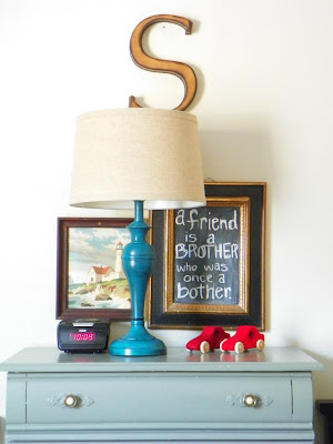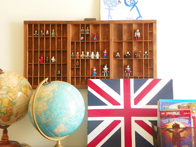 I can't take full credit for this idea but I love it! This vintage printer's tray holds the boys' Lego people. The painting above the tray was done by my son right after we found out we would be adding a third baby to our family.