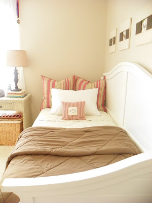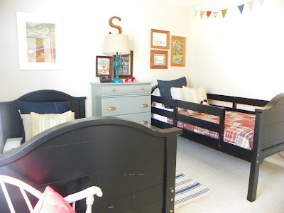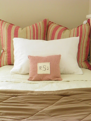 This is our playroom/guestroom turned into our oldest son's bedroom. You can read more about the striped shams here. The pillow in front is a pillow I made for him when he lost his first tooth. There is a pocket on the front where he places his tooth for the tooth fairy to collect.
