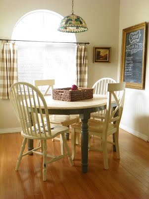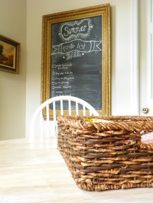 Behind the living room is the kitchen and eating area. Our kitchen is really ugly bottom of the line builder grade so we'll skip that area but here is the breakfast nook. The chalkboard holds quotes and birthday messages, whatever event happens to be going on, but at the moment it is where we are creating our summer activity list.