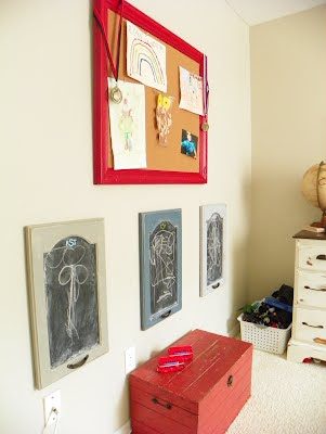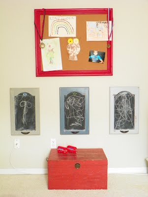 The bulletin is made from an old frame I had in storage. I will be writing more about it later. The personal chalkboards were talked about here. They each have their own and draw on them daily.