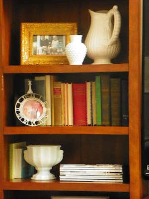 My hubby was a state chess champ when he was younger so one of the glass urns is filled with some chess pieces he bought in Austria once. The other has an Ikea plant in it.