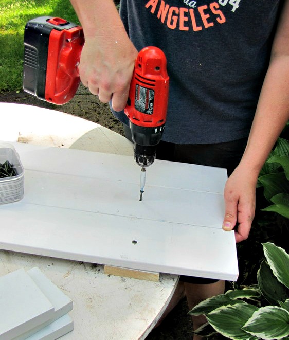 Drill from the back of the shutters, attaching the smaller piece to all 3 long pieces.