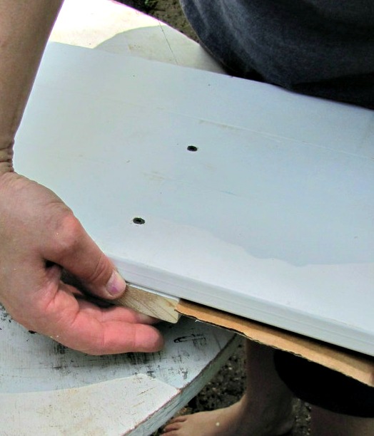 Attach these boards using the smaller board you had cut, the batten (placed UNDER the boards while your drilling).