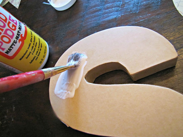 Start with some paper (wrapping, map, construction, etc..., Mod Podge, and an initial letter (which you can sometimes find in the dollar bin at Target).