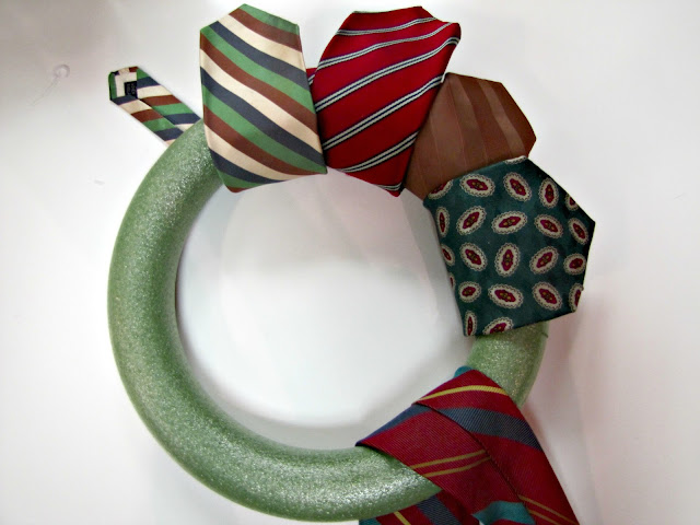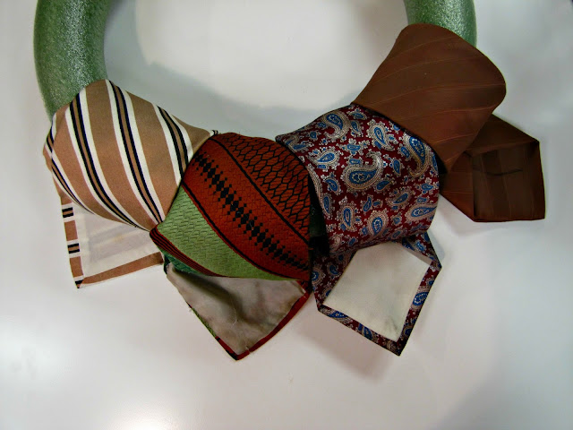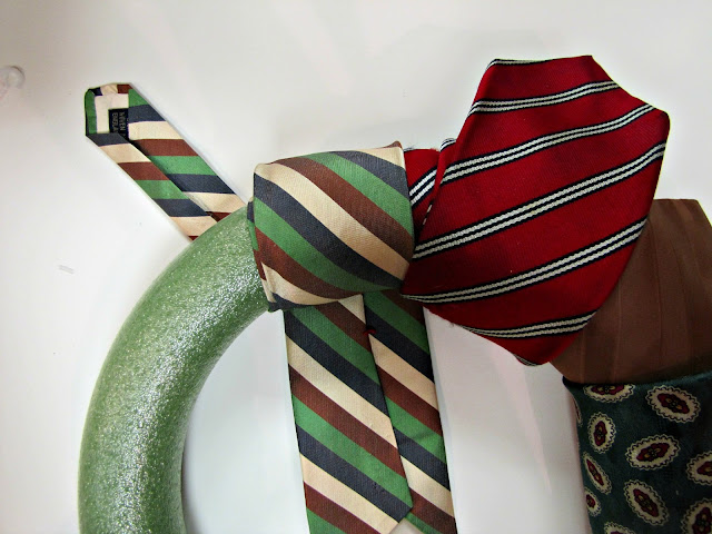 For this Christmas wreath, I separated out the colors, using only greens, reds and gray ties. (I'll save the other colors for a Father's Day wreath.)