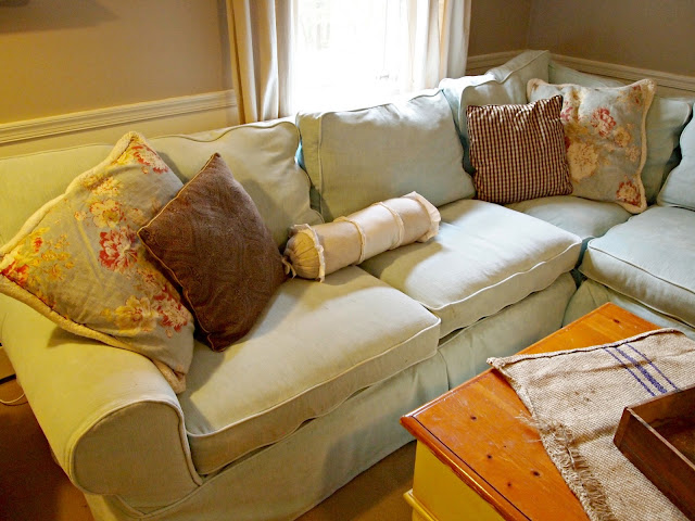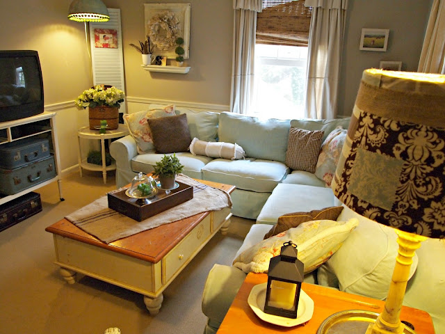 DeleteNo wonder you guys like to hang out there already. Great room and so cozy. Love your collections too. We really want to try a sectional in our family room one of these days. I'm wondering, what colour is the sectional slipcover? It looks almost blue or sage-ish.