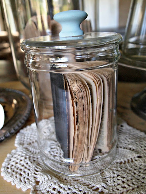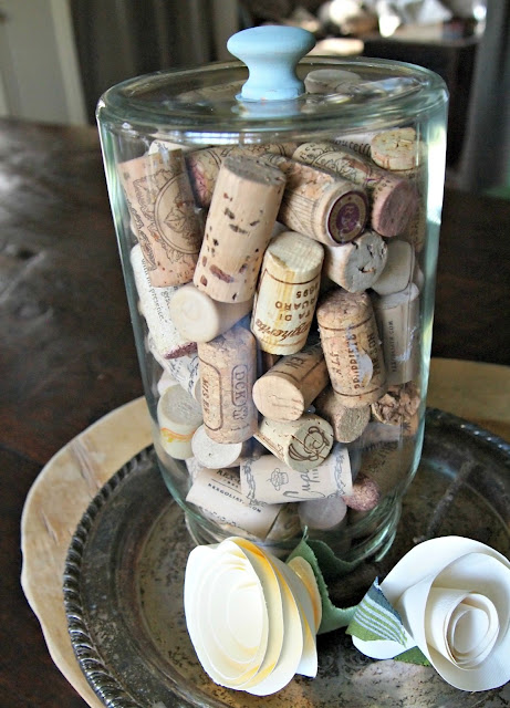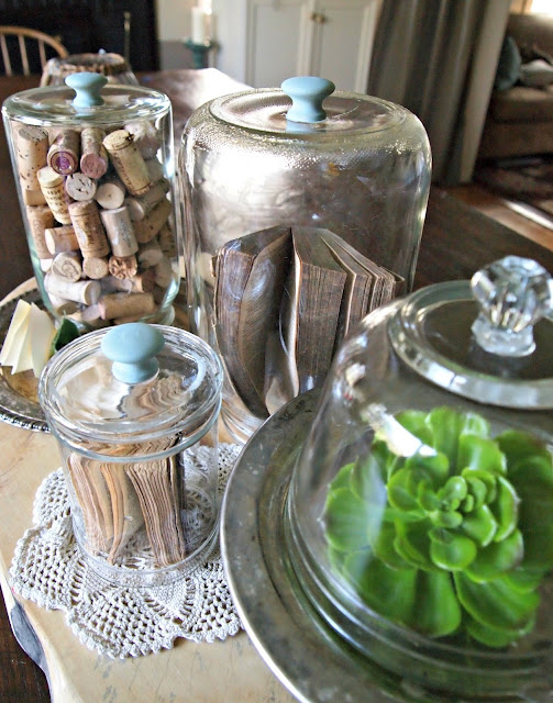 Inside the jars I added some books I found at an auction, a fake succulent, and some corks.