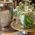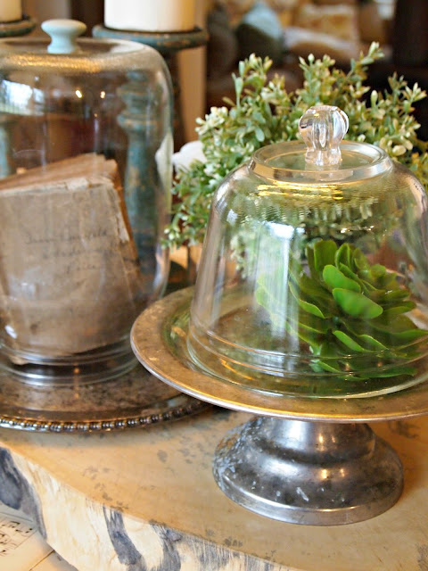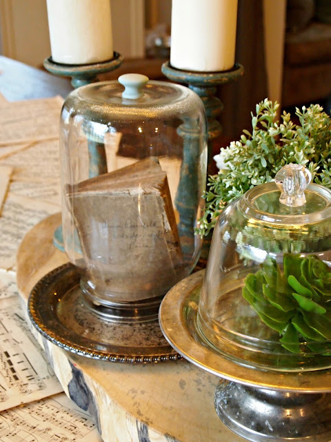 I used silver trays, crocheted doilies and a slice of wood to mix up the textures.