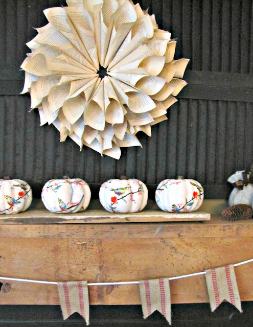 I reused the old black metal shutters that used to hang on our house as a back drop for the vintage paper wreath. (remember it's Fall, so layer people layer!)