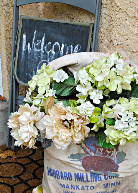 I also added this flour sack covered basket of fake flowers to the front entrance.