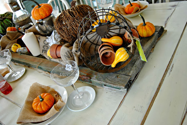 The layering, the burlap, the shutter, the distressed white table. I could start hyperventilating.