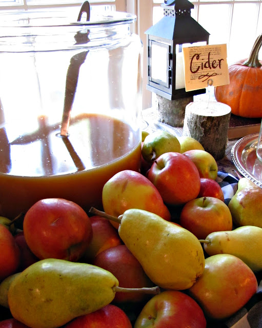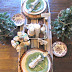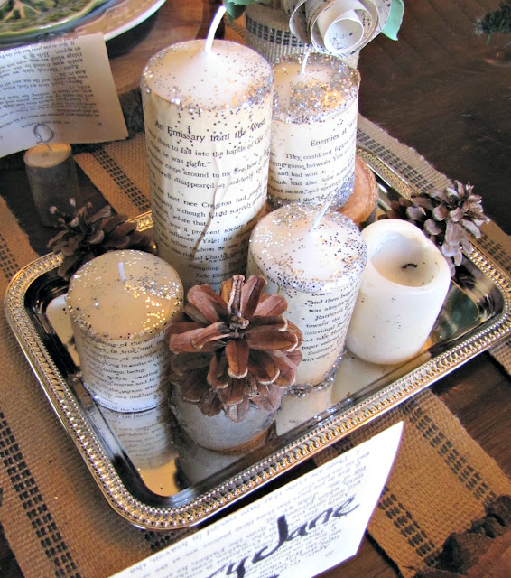 In the center of the table I placed glittered and paper wrapped candles on a silver tray with pine cones and logs sprinkled around about.