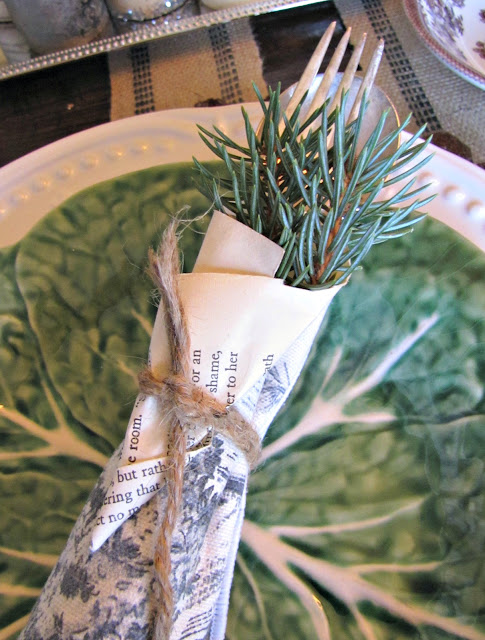 I tied the silverware up with a black toile napkin, and some springs of pine nestled in a paper cone.