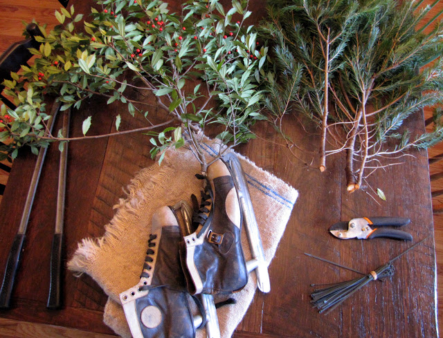 then, layer...the burlap, cuttings, ice skates, ribbon.